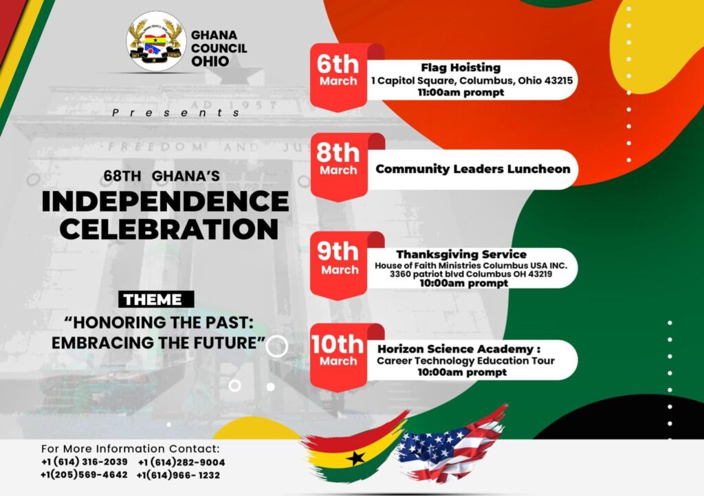 The Ghanaian community in Ohio is set to commemorate Ghana’s 68th Independence Anniversary with a series of events aimed at celebrating the country’s rich heritage while fostering unity and progress. Organized by the Ghana Council Ohio, the celebrations will take place across various locations in Columbus from March 6th to March 10th, 2025 under the theme “Honoring the Past: Embracing the Future.”